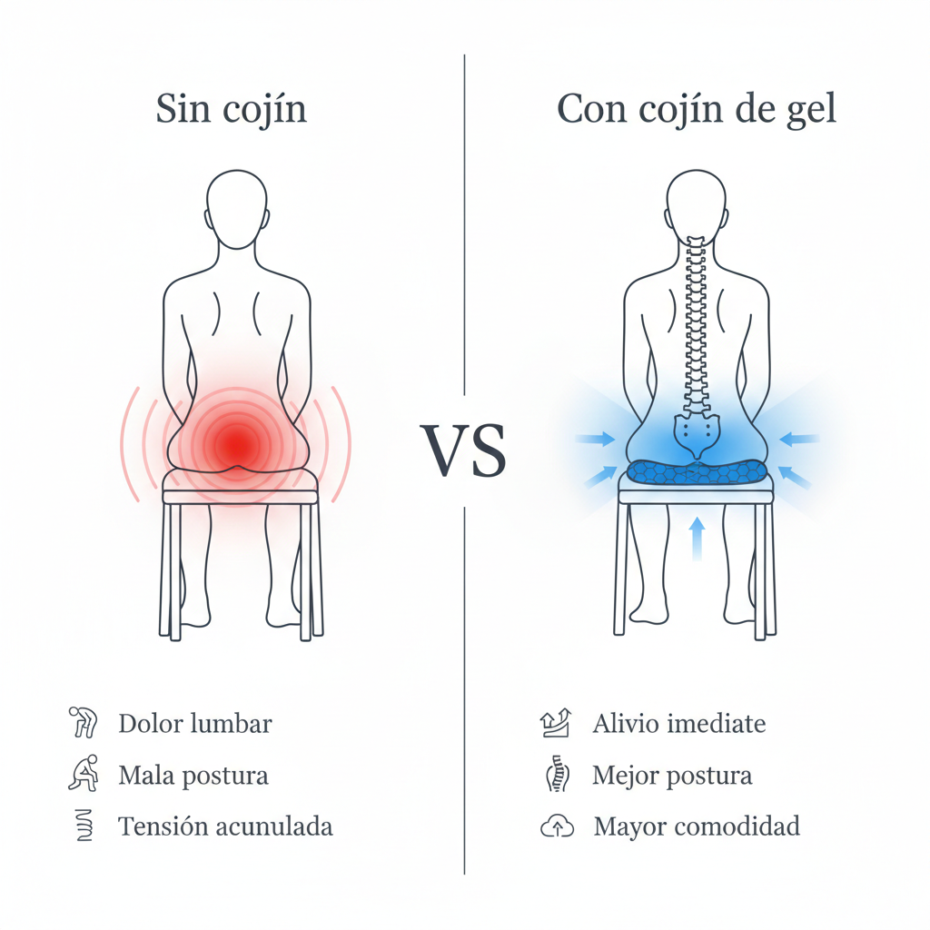Sí. Su estructura de gel con diseño tipo panal absorbe la presión y proporciona soporte ergonómico, lo que ayuda a reducir el dolor y la incomodidad al sentarse. Los resultados pueden variar según cada persona, pero la mayoría nota alivio desde los primeros usos.